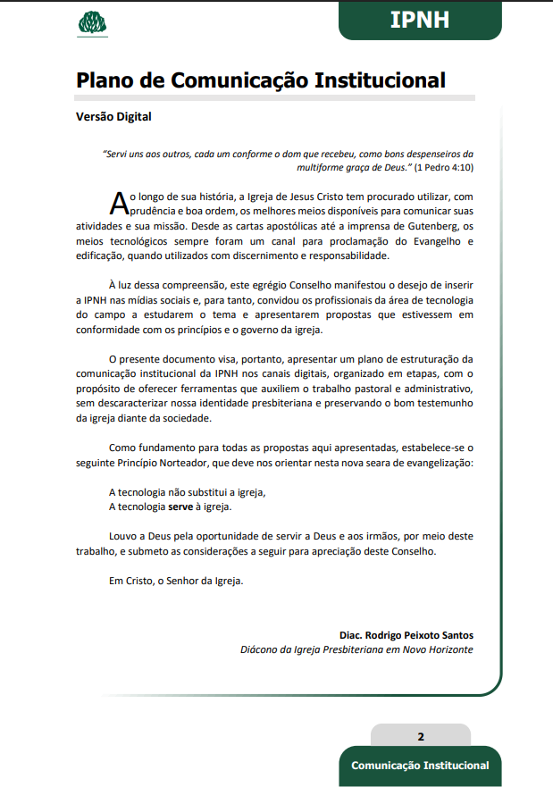 O Ministério de Comunicação da igreja Presbiteriana em Novo Horizonte (IPNH) tem como missão ser um canal para a proclamação do Evangelho e edificação da igreja, utilizando os meios tecnológicos com discernimento e responsabilidade, para que as atividades e a missão da igreja sejam comunicadas com clareza.